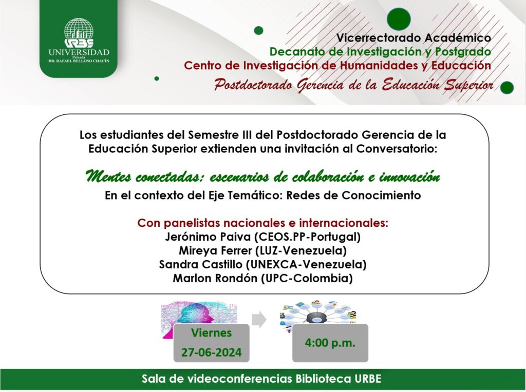 Participación del día viernes 27 de junio de 2025 como invitado internacional en el conversatorio Mentes Conectadas: Escenarios de Colaboración e innovación. Esta invitación fue extendida por los estudiantes de tercer semestre del Postdoctorado Gerencia de la Educación Superior, el cual se imparte en la Universidad Privada Dr. Rafael Belloso Chacín (URBE), Venezuela.