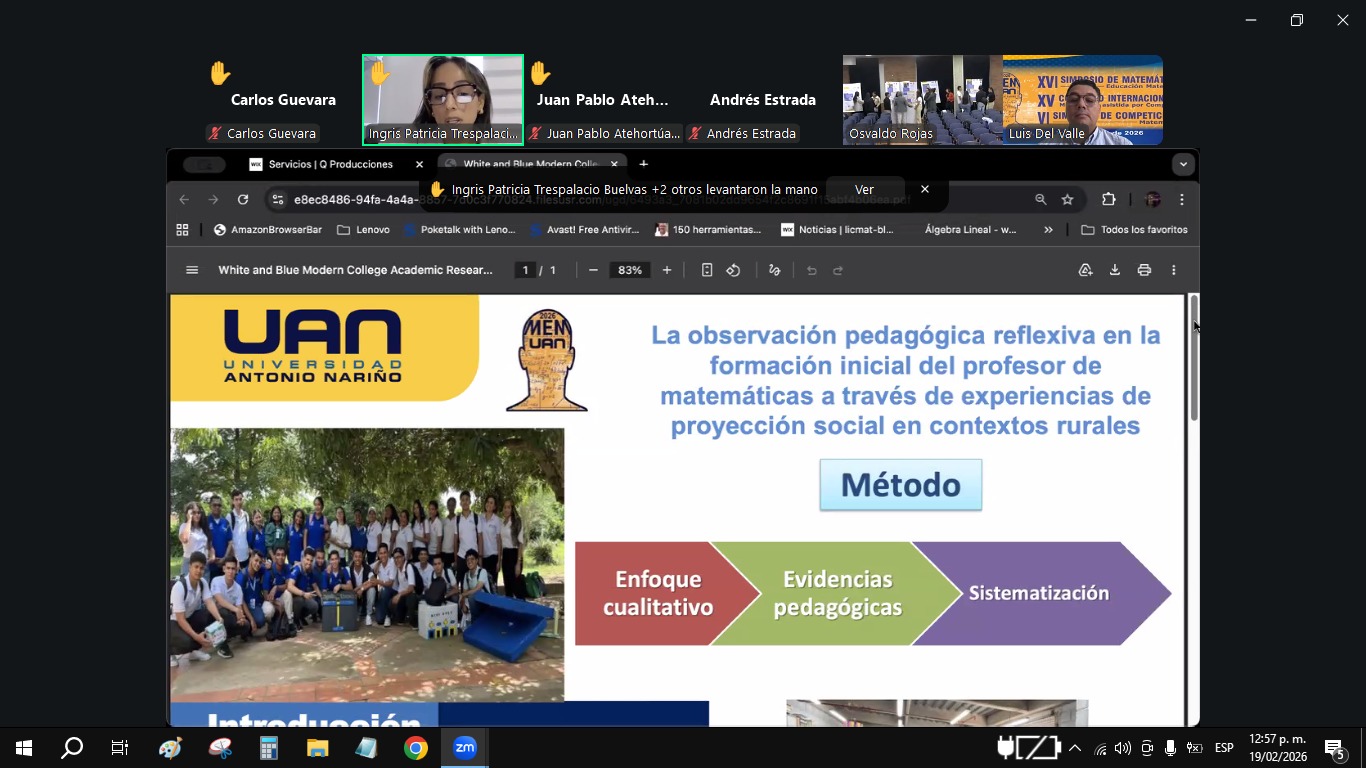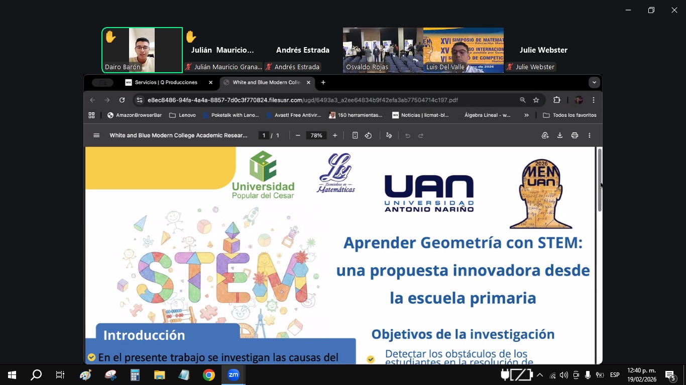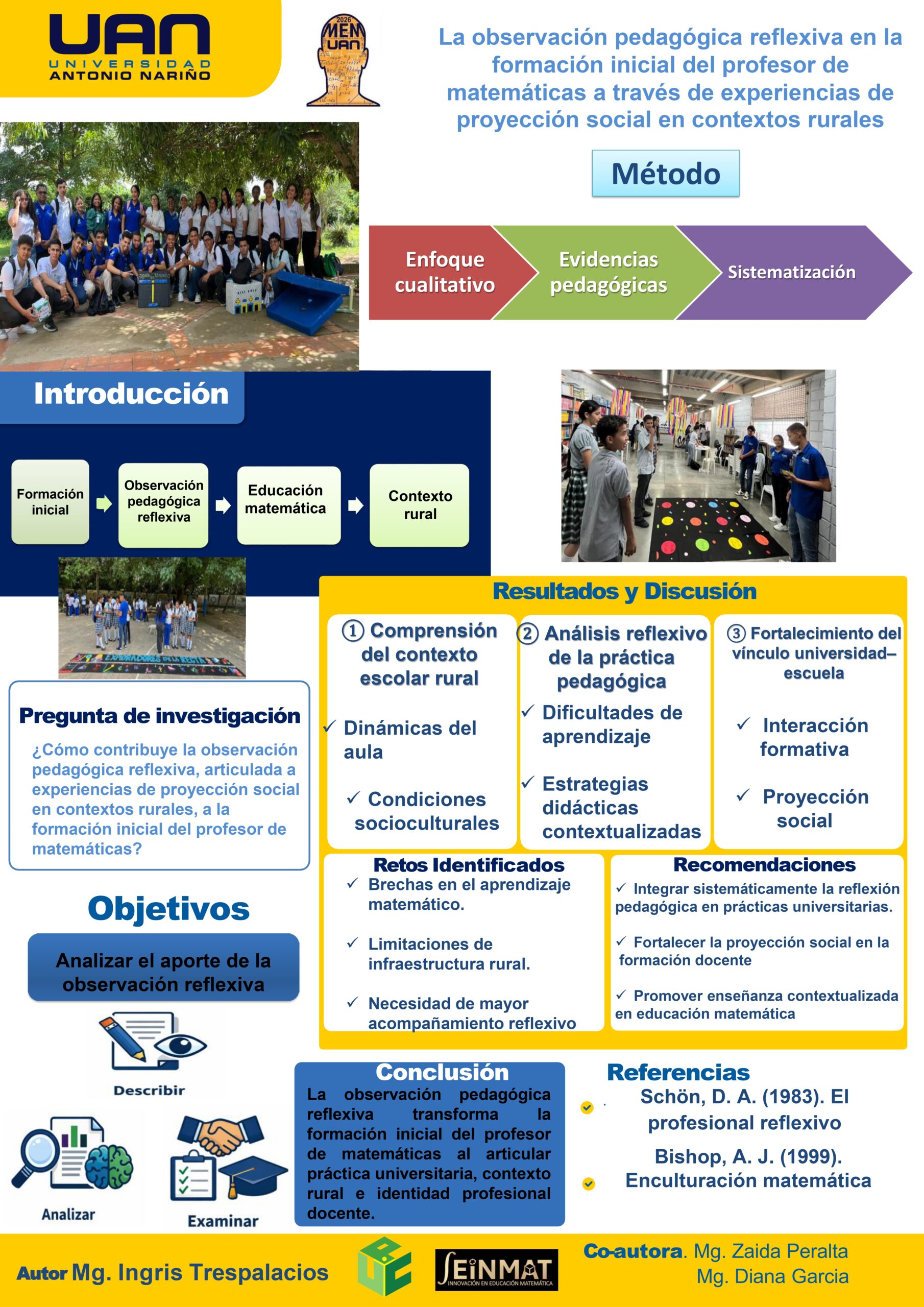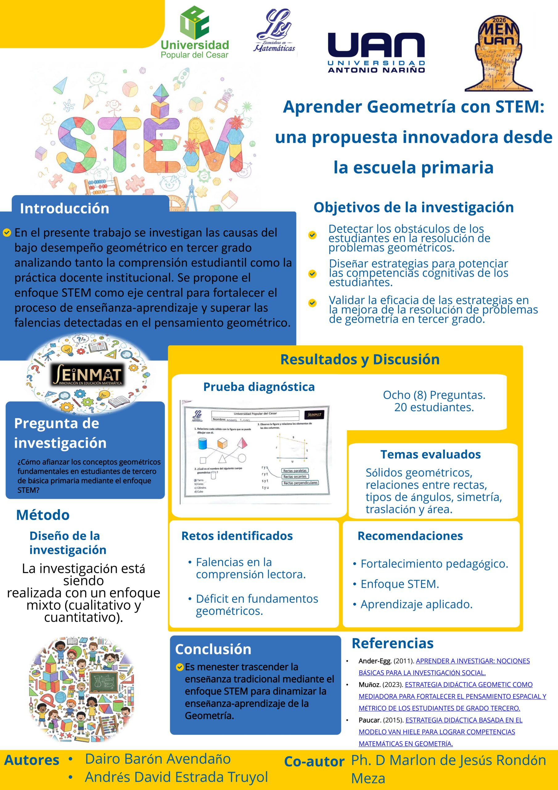 En el marco del evento MEM 2026, organizado por la Universidad Antonio Nariño y realizado del 18 al 21 de febrero de 2026, integrantes del Semillero de Investigación SEINMAT y docentes de la Universidad Popular del Cesar participaron con éxito en la modalidad Póster Virtual, exponiendo los avances de sus trabajos de investigación. Esta destacada participación no solo representó con orgullo a la institución, sino que también dejó en evidencia el constante fortalecimiento y la calidad del trabajo investigativo que se desarrolla en la universidad.